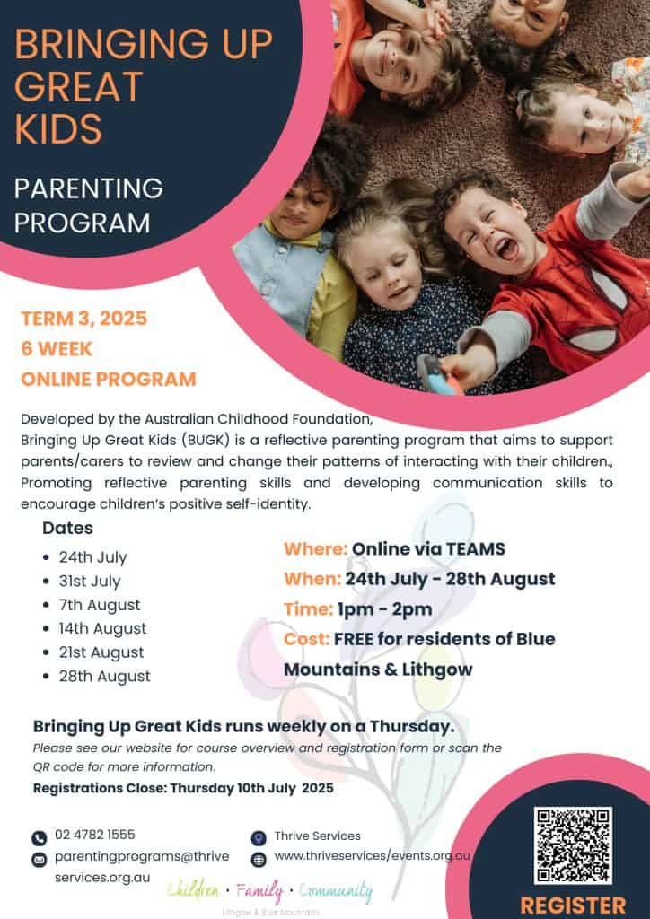 Bringing Up Great Kids (BUGK) is a reflective parenting program that aims to support parents/carers to review and change their patterns of interacting with their children., Promoting reflective parenting skills and developing communication skills to encourage children’s positive self-identity.