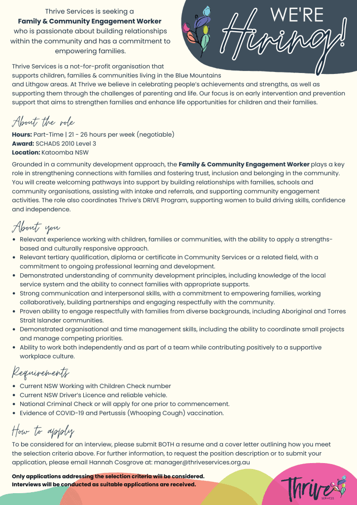 Thrive Services is seeking a Family & Community Engagement Worker who is passionate about building relationships within the community and has a commitment to empowering families.