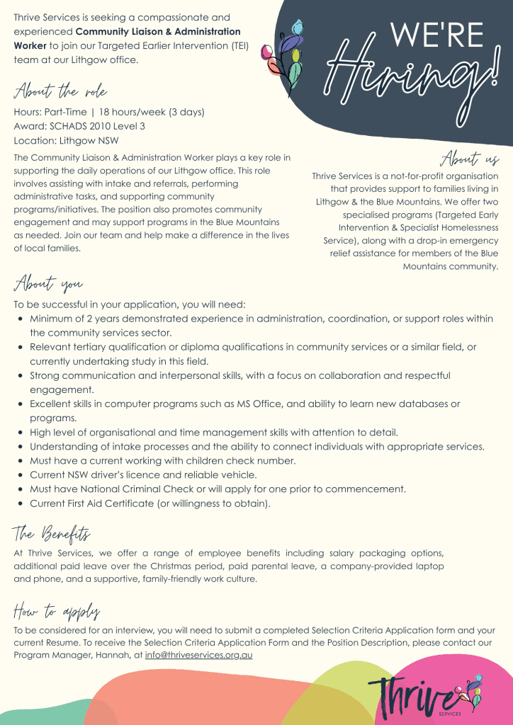 To be considered for an interview, you will need to submit a completed Selection Criteria Application form and your current Resume. To receive the Selection Criteria Application Form and the Position Description, please contact our Program Manager, Hannah, at info@thriveservices.org.au using the subject line: Community Liaison & Administration Worker – Lithgow enquiry. Or complete the application request form on the right. We are eager to fill the position as soon as possible with the right applicant. We will be conducting interviews for suitable applicants as they are received.